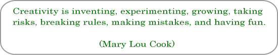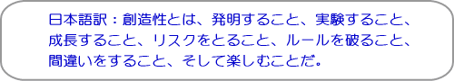 人間は安定を求め、変化を嫌うものですが、常に新しいこと、面白そうなことを実験し、失敗や人からの評価を気にすることなく楽しんで自分の創造性を掘り起こしてみましょう。きっと今まで出会ったことのない、新しい自分と出会えることでしょう。そうしたら人生も学習ももっと楽しくなっていくと思いますよ。